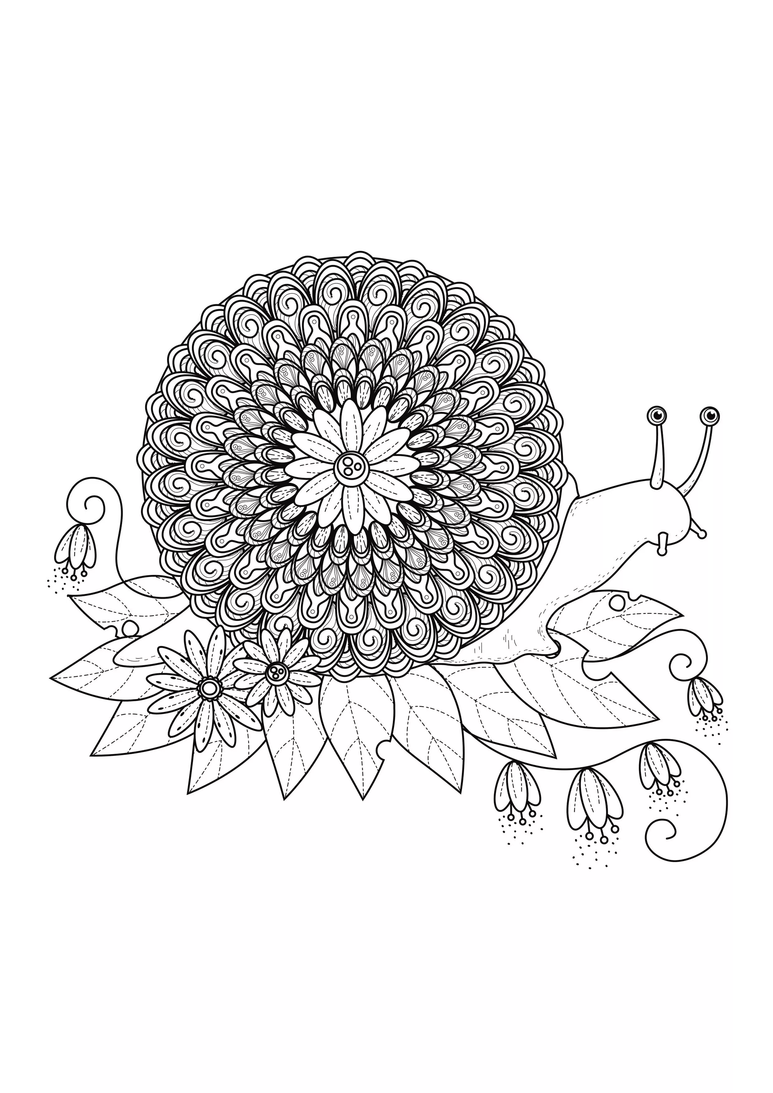Ein Mandala, das eine langsame, aber hübsche Schnecke in Szene setzt, für diejenigen, die lieber konkrete und lebendige Elemente in Farbe umsetzen.